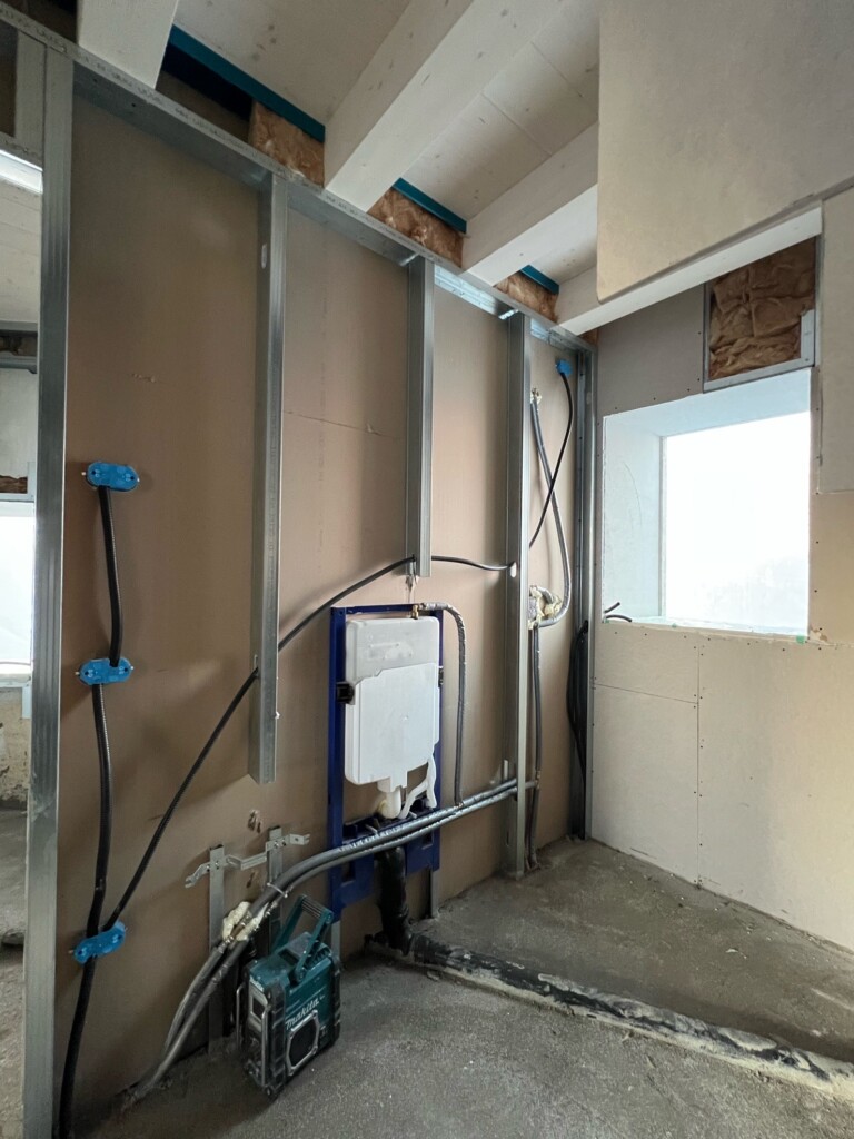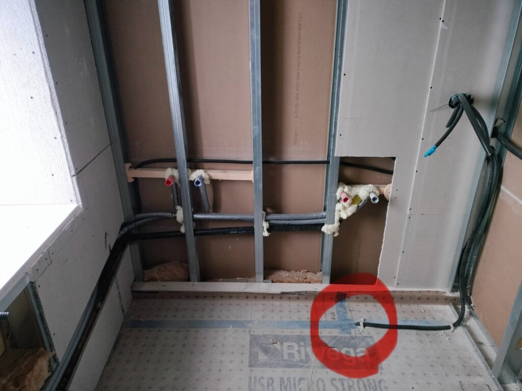今見えているのは壁が付いたら見えなくなる部分で、電気の線が通る黒いチューブや水道管が通っているよ。