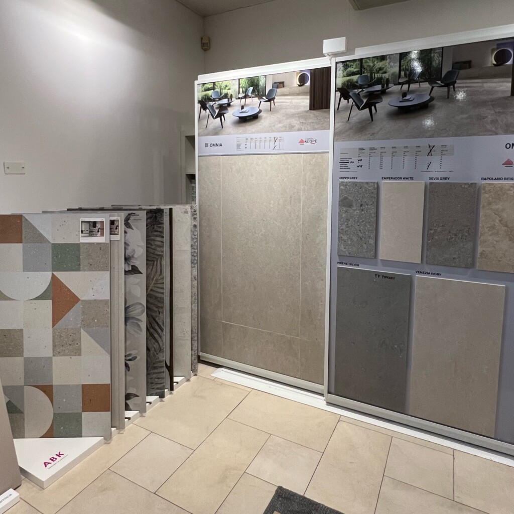 1階のショールームはシャワーやトイレ洗面所関係で、地下はタイル関係。