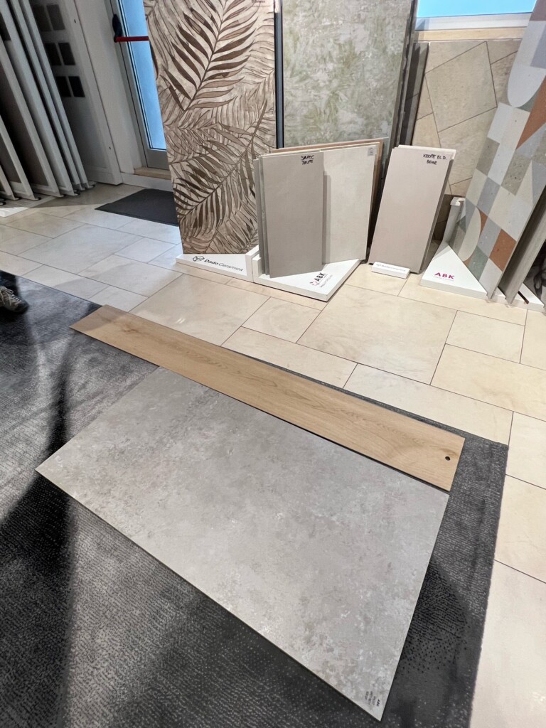 既に決まっているリビングの床材Clap!(奥)を元に合うか並べて検証中の玄関用のタイル。